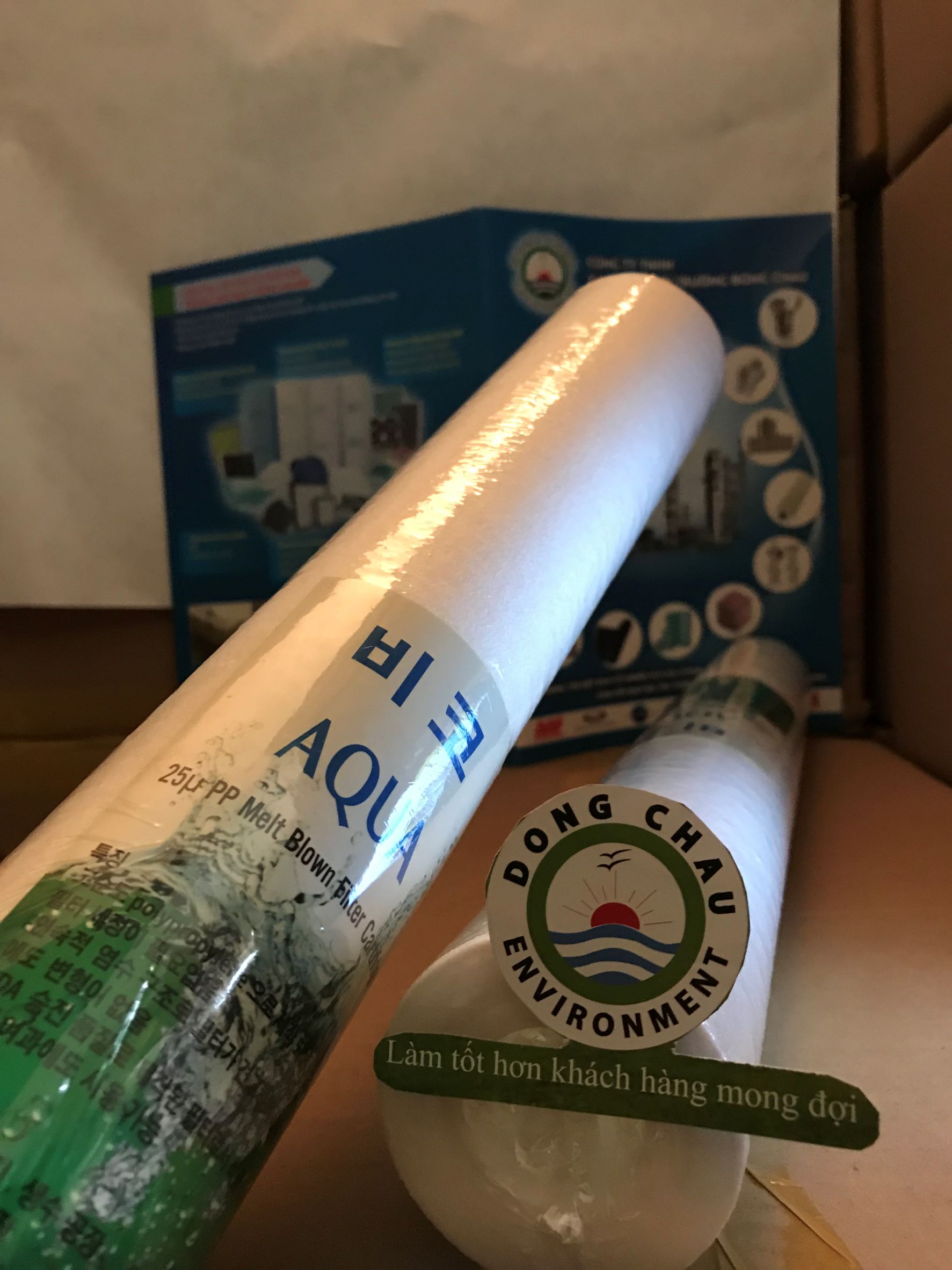 Lõi lọc nén 25 micron 20 inch Aqua mang thành phần hóa học PP sạch, phù hợp với tiêu chuẩn vệ sinh thực phẩm.